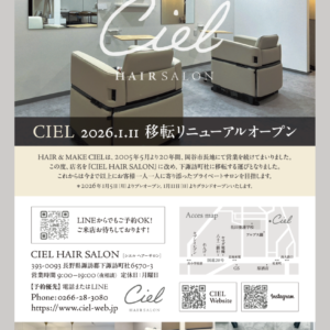 スタッフブログ インナーカラー❗️ 定期的にご来店のお客様。 ブリーチなしのインナーカラー、色味はラベンダーアッシュで透明感のある仕上がりに(^^) ブリーチ出来ない方、派手過ぎずさりげなく楽しみたい方におすすめです(^_-)-☆ この記事を書いた人 市川 順也 最近の投稿記事 ブログ2024.11.27クリスマス❗️ ブログ2024.11.19イルミネーション❗️ ブログ2024.11.14くせ毛風パーマ❗️ ブログ2024.11.12インナーカラー❗️ 最近の投稿 2025.11.21移転のお知らせ!2025.11.21バッサリイメチェン✂️⸒⸒2025.11.14CIELコンペ⛳2025.11.14COREME campaign˖⁺⑅̥ ⑅⿻ ciel.hairmake CIEL TRIP👘🍁2024.11/24.25 飛騨高山→石 ˗ˏˋ recruitˎˊ˗ CIELでは一緒に働いて 11月定休日のお知らせ📢 今月、11/24. Happy Halloween🎃🤎2024.10/31 今年の仮装 \\ 聖矢 // 国家試験✂︎ 合格おめでと 10月のお休み🎃 毎週月曜日 第一火 🍁秋のダメケア&セルフケアキャンペ 8月のお休み🌻” 毎週月曜日定休 ストレート&デジパーキャンペーン ☔️☔️ いよいよ今日から雨続きの さらに読み込む Instagram でフォロー ご予約はこちら TEL.0266-27-7827 営業時間:9:00-18:00 定休日:毎週月曜日/毎月第一火曜日、第三日曜日 Web予約で10%OFF 予約フォーム